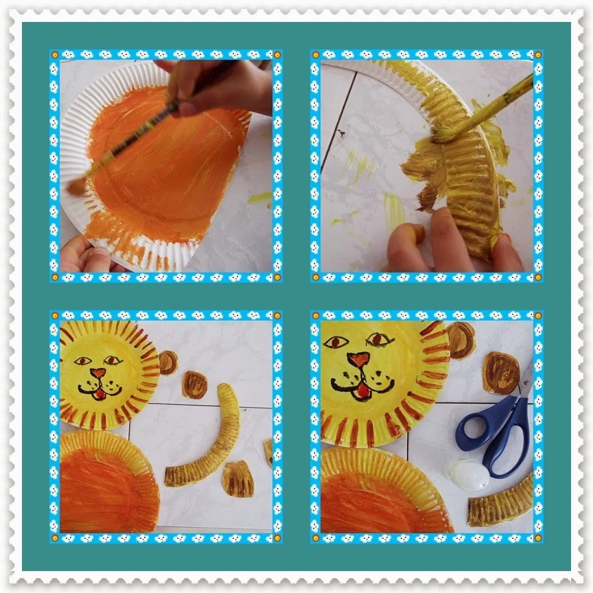 O farfurie am lăsat-o întreagă, ea fiind capul leului, alta am tăiat-o în partea de jos, pentru corp; urechile , coada și picioarele le-am decupat din a treia farfurie.